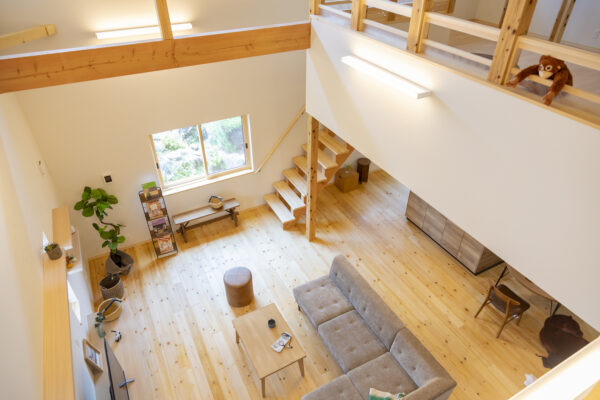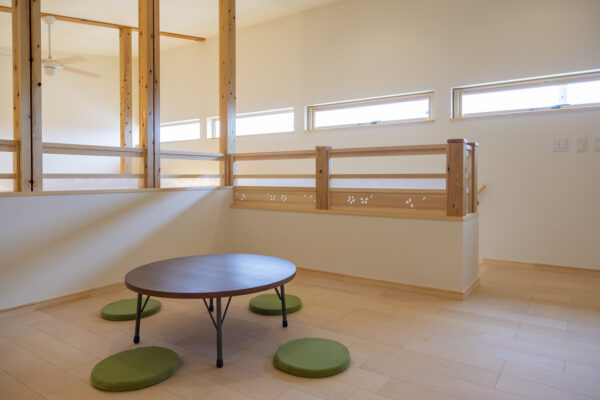 2階は間仕切りを設けず、フリースペースとして計画。こどもの遊び場や、ちょっとした作業、来客時のくつろぎスペースなど、柔軟に使える場として暮らしに溶け込んでいます。
