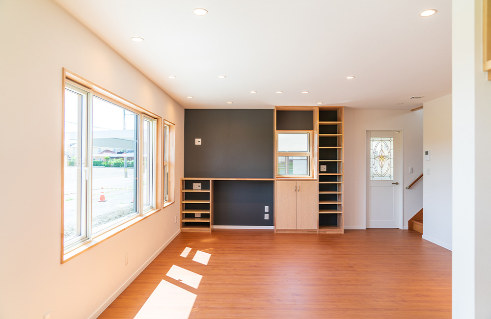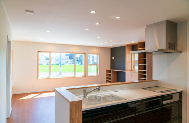 清潔感のある白を基調とし、採光と風通しのよい住宅です。キッチンからリビングのすべてが見渡せ、大容量収納のご要望にもお応えいたしました。